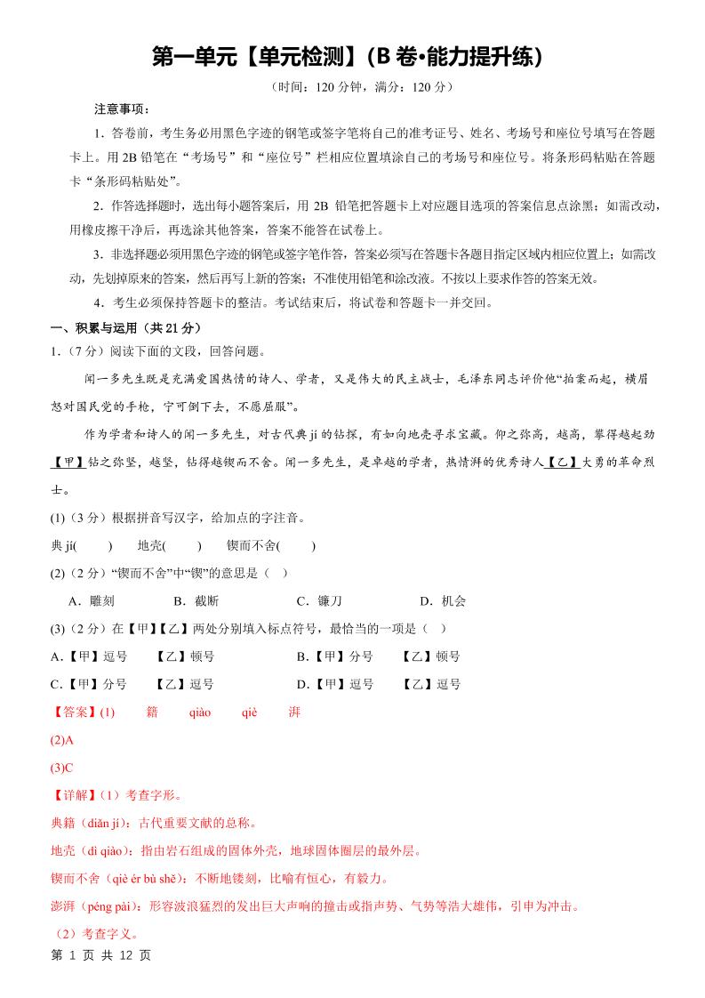 首页 > 全部 > 单元提升卷 > 1.第一单元【单元检测】(B卷•能力提升练)(解析版)