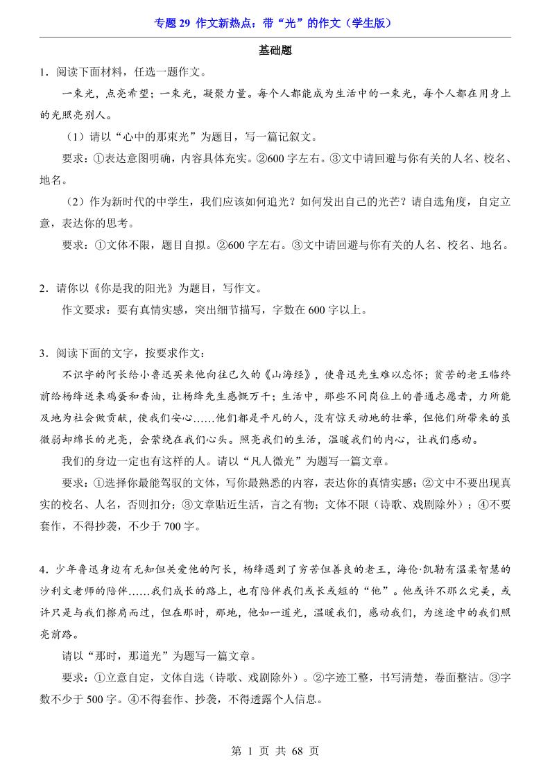 专题29 作文新热点:带“光”的作文
