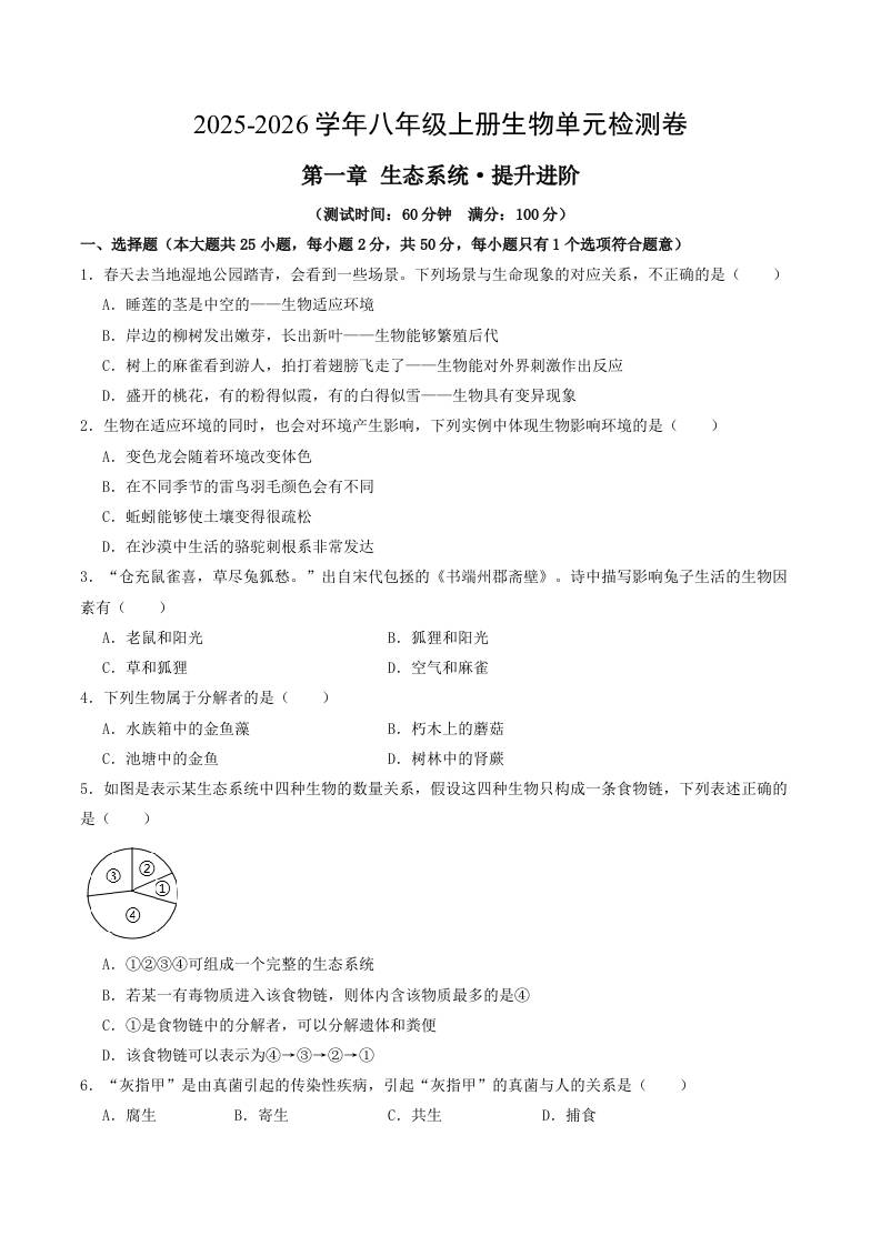 第五单元第一章 生态系统(单元测试·提升卷)(考试版A4)