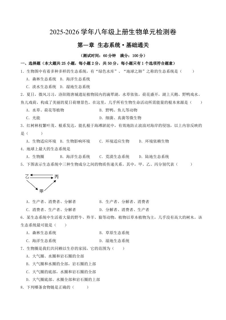 第五单元第一章 生态系统(单元测试·基础卷)(考试版A4)