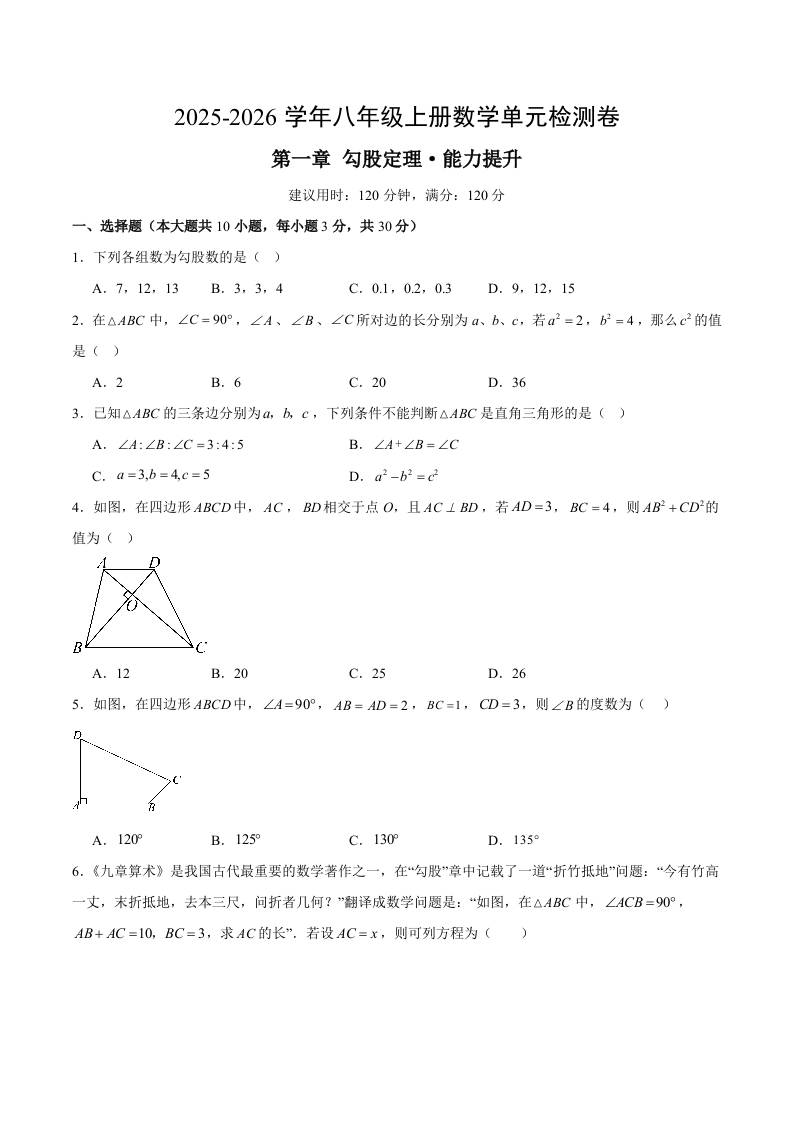 首页 > 全部 > 单元提升卷 > 2.第一章 勾股定理测试·提升卷(考试版A4)