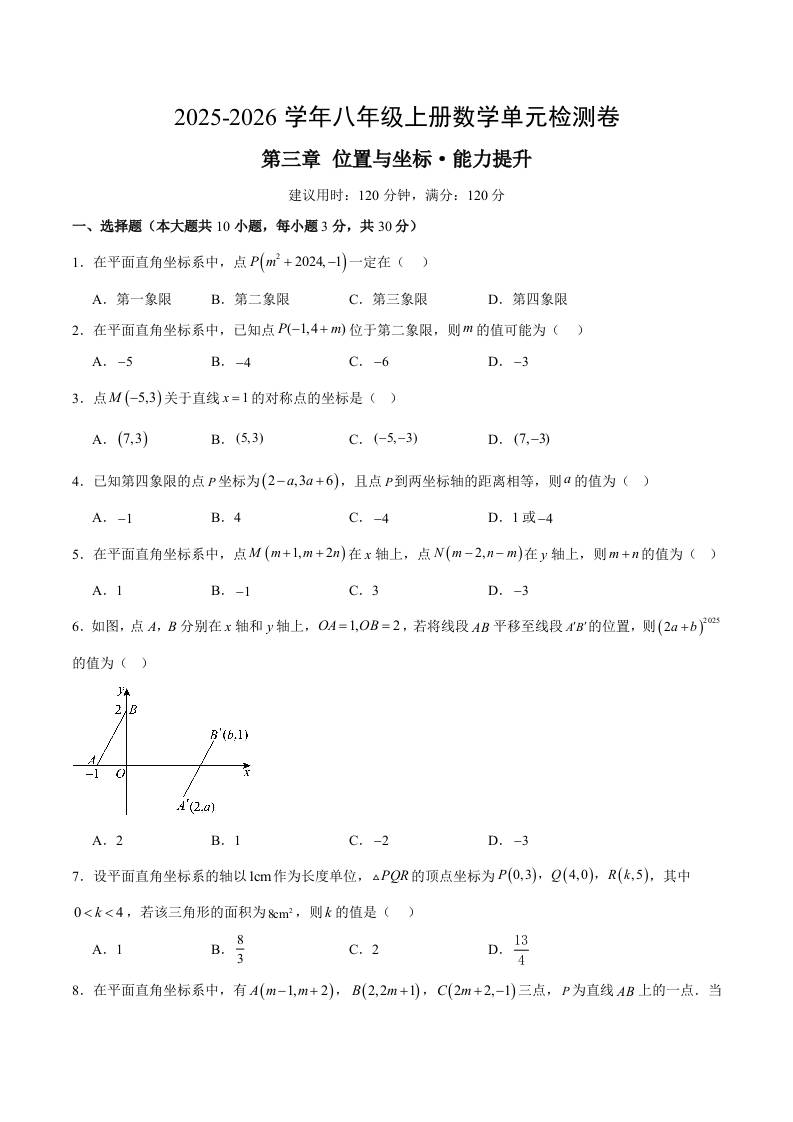 首页 > 全部 > 单元提升卷 > 八上数学第三章 位置与坐标测试·提升卷(考试版A4)