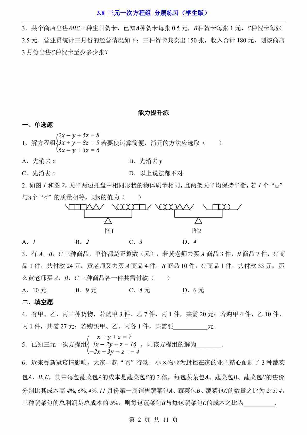 首页 > 全部 > 一课一练 > 3.8 三元一次方程组(分层练习)
