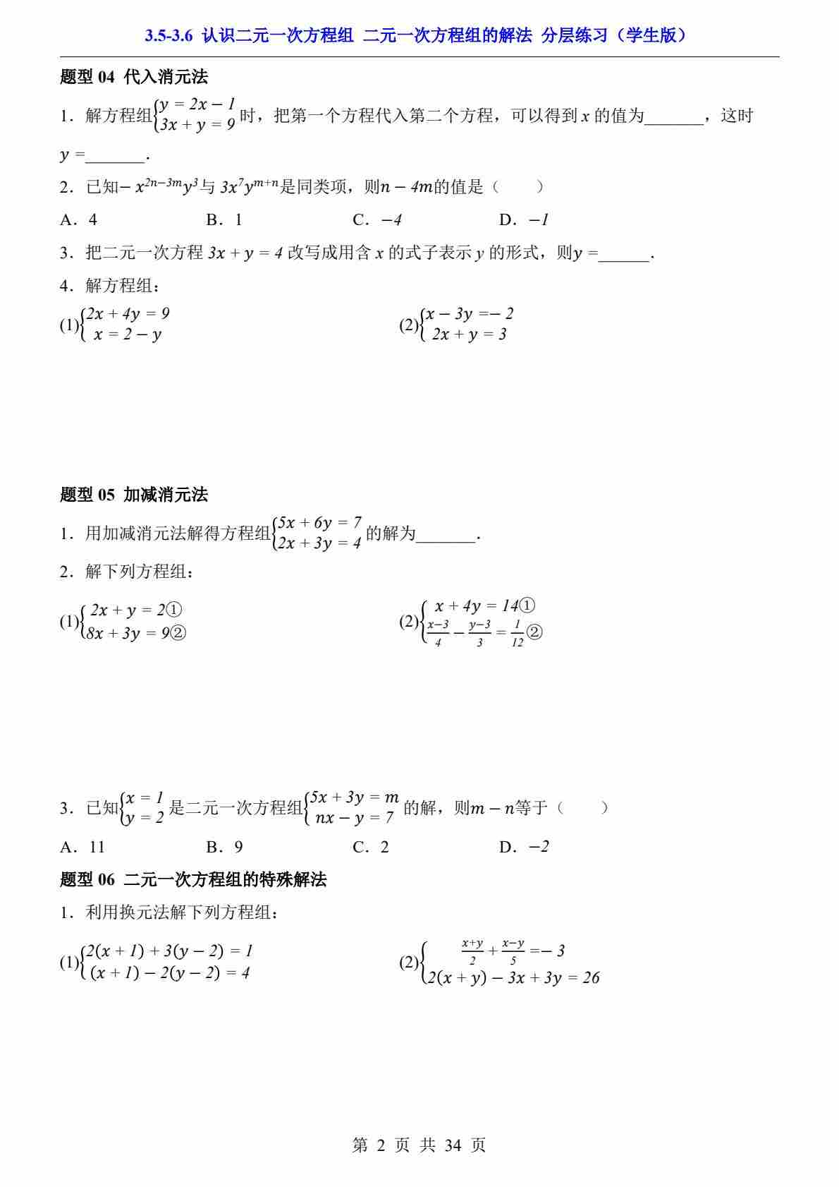 3.5-3.6 认识二元一次方程组 二元一次方程组的解法(分层练习)
