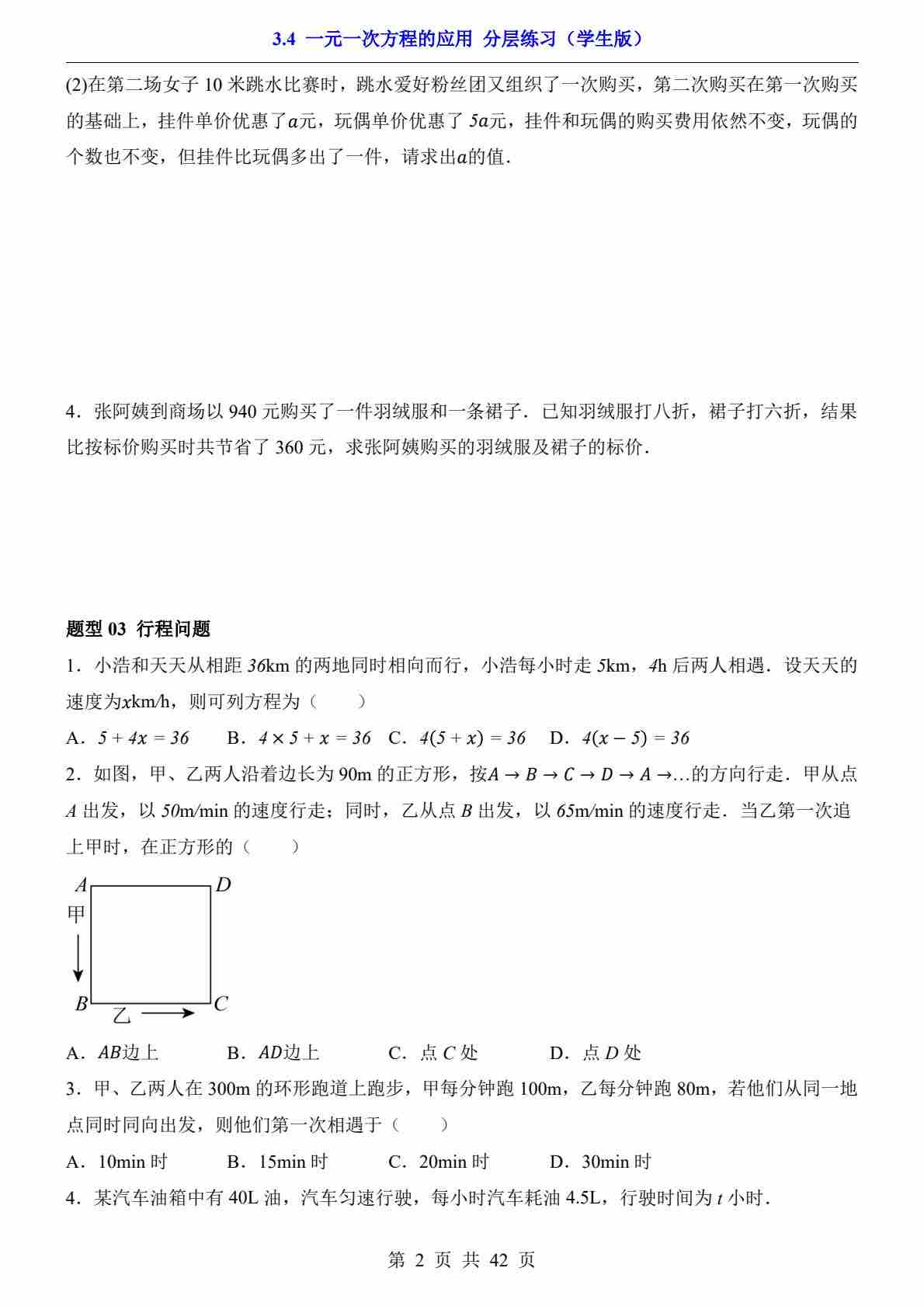 首页 > 全部 > 一课一练 > 3.4 一元一次方程的应用(分层练习)