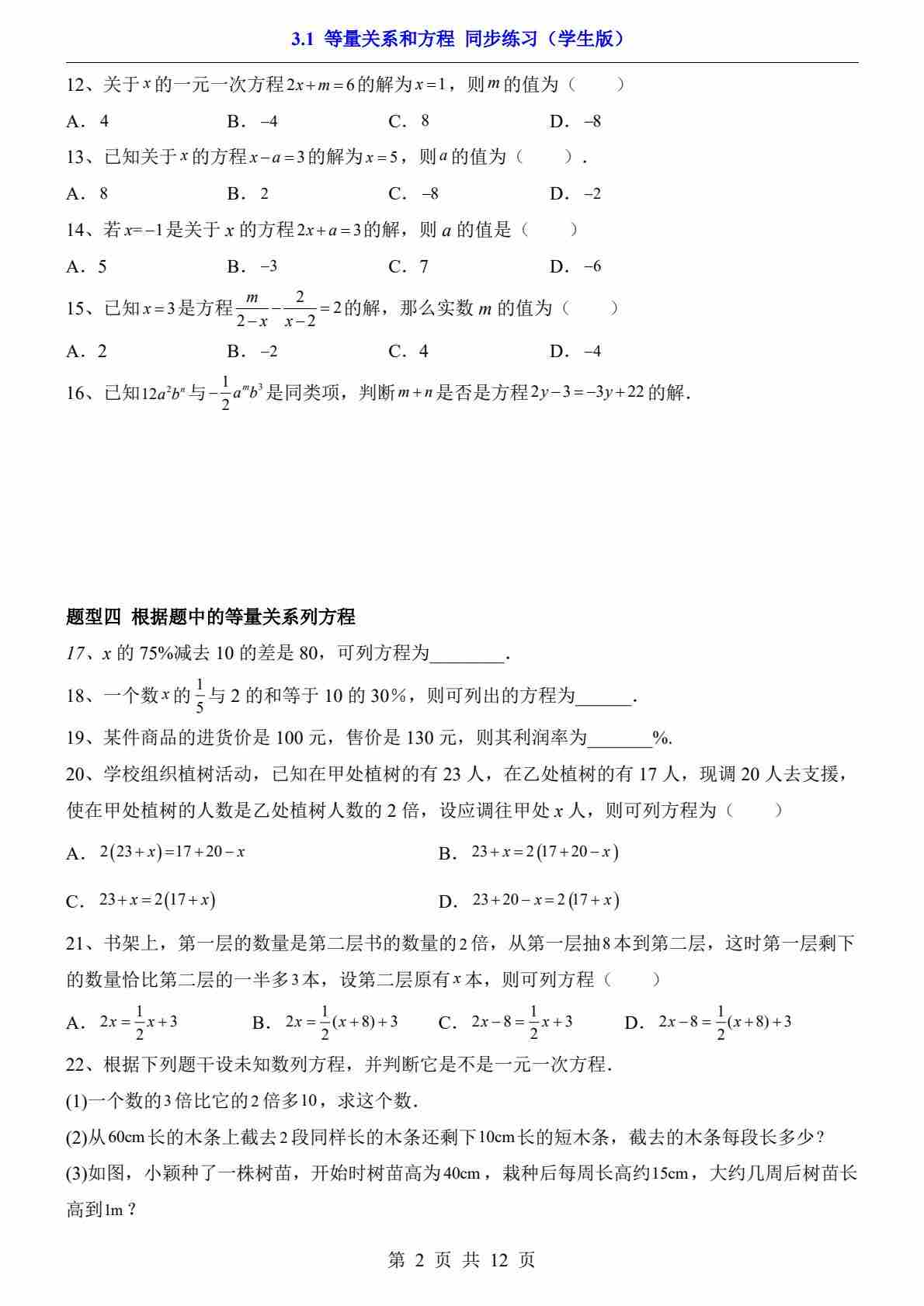 首页 > 全部 > 一课一练 > 3.1 等量关系和方程(分层练习)