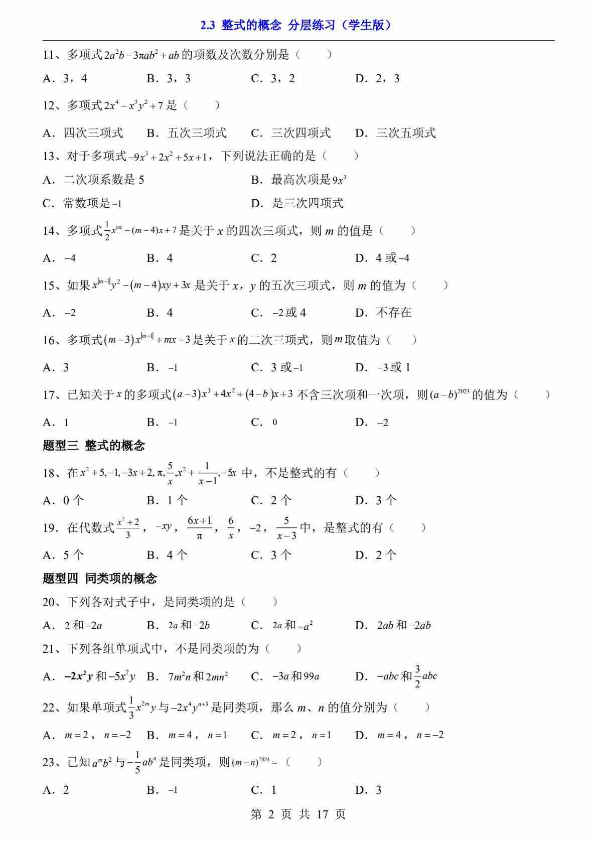 首页 > 全部 > 一课一练 > 2.3 整式的概念(分层练习)