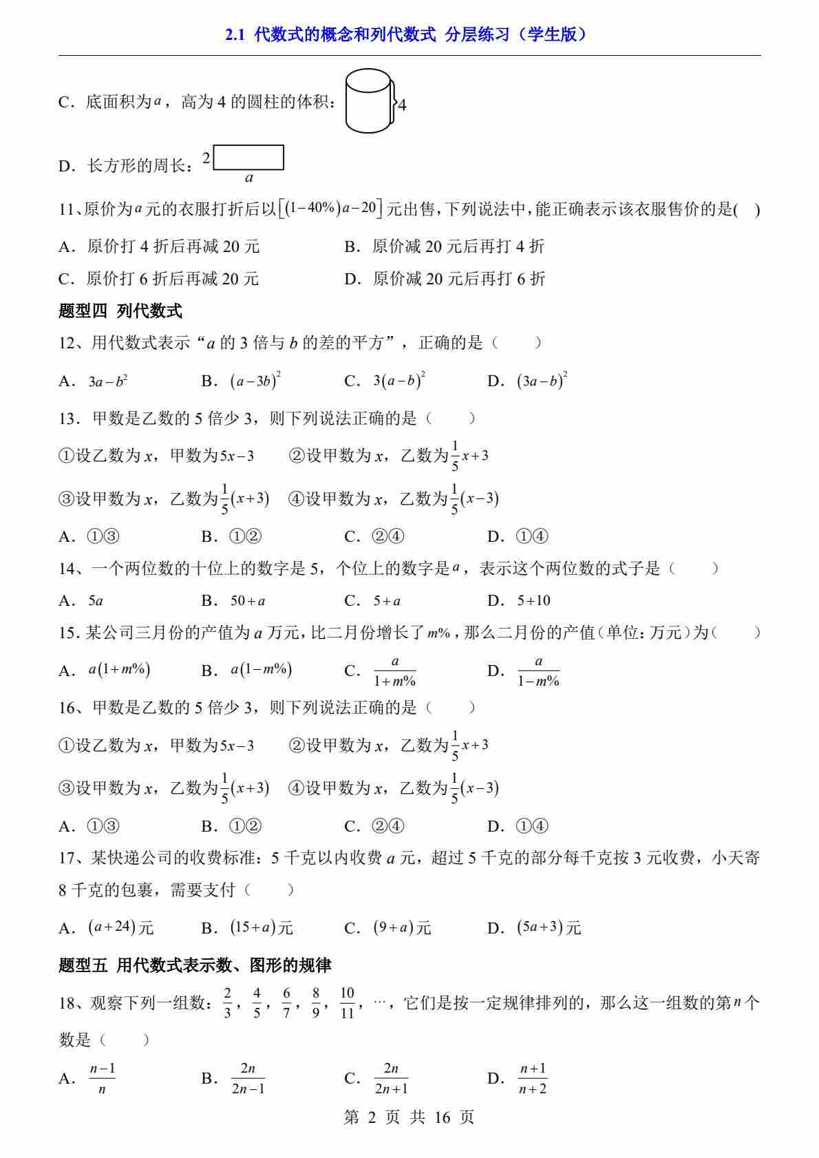 首页 > 全部 > 一课一练 > 2.1 代数式的概念和列代数式(分层练习)