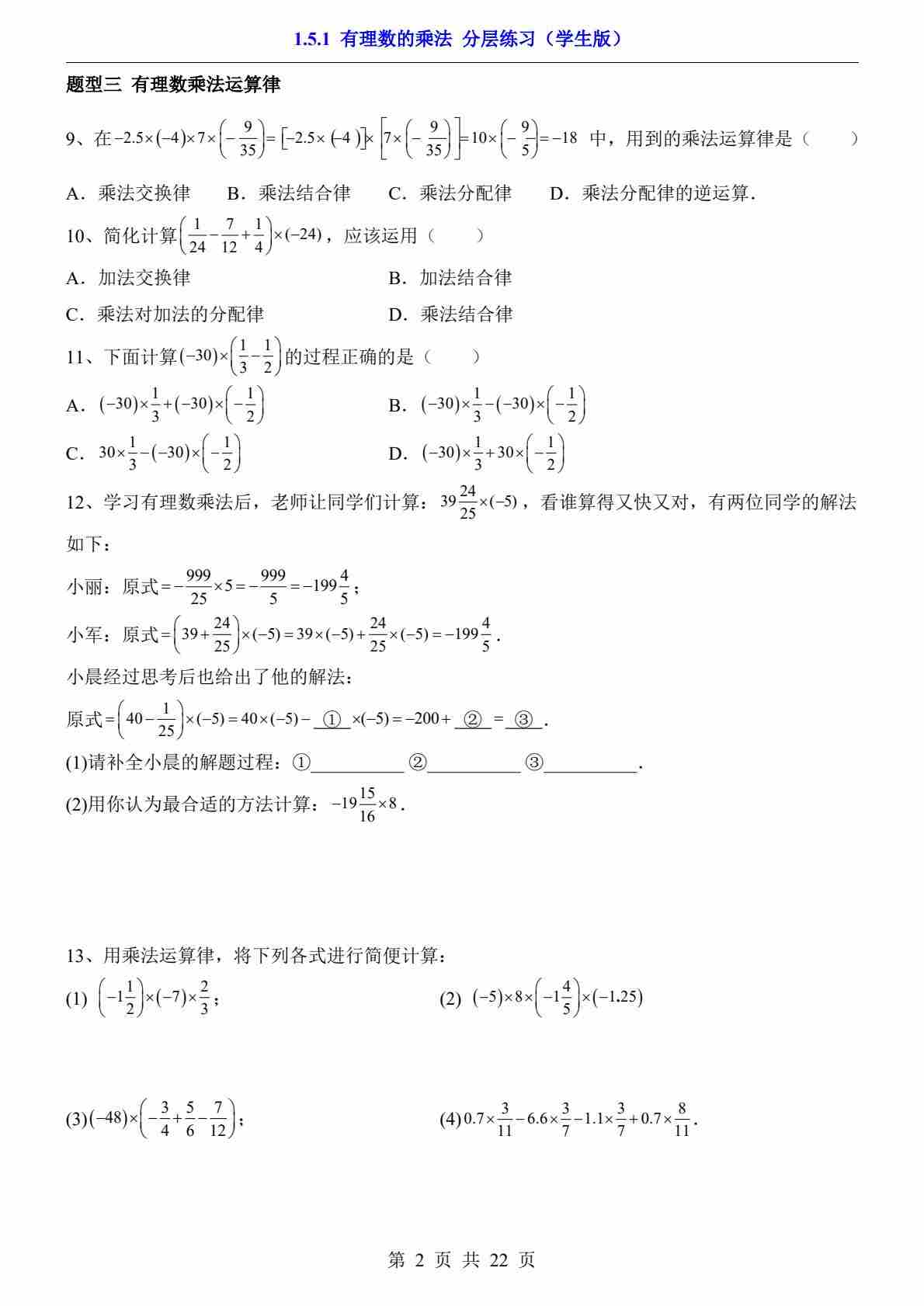 1.5.1 有理数的乘法(分层练习)
