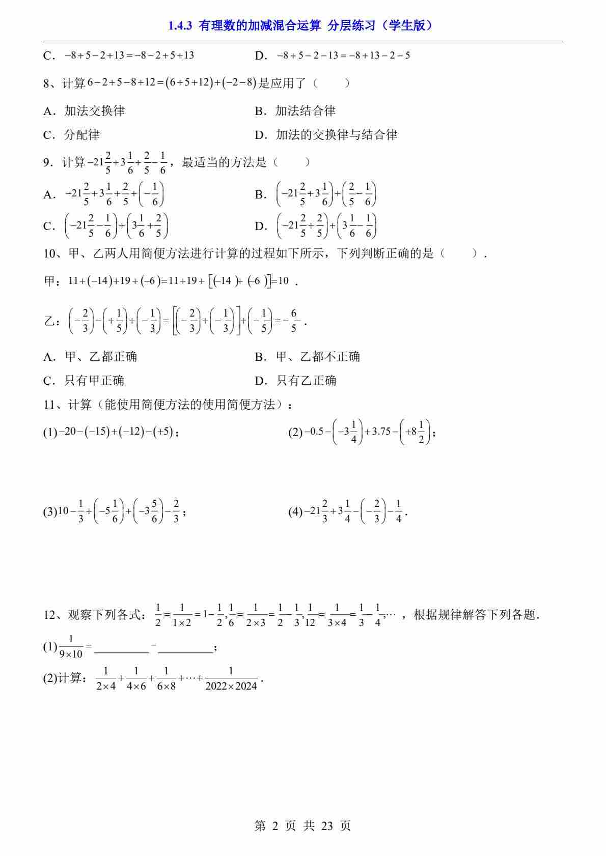 首页 > 全部 > 一课一练 > 1.4.3 有理数的加减混合运算(分层练习)