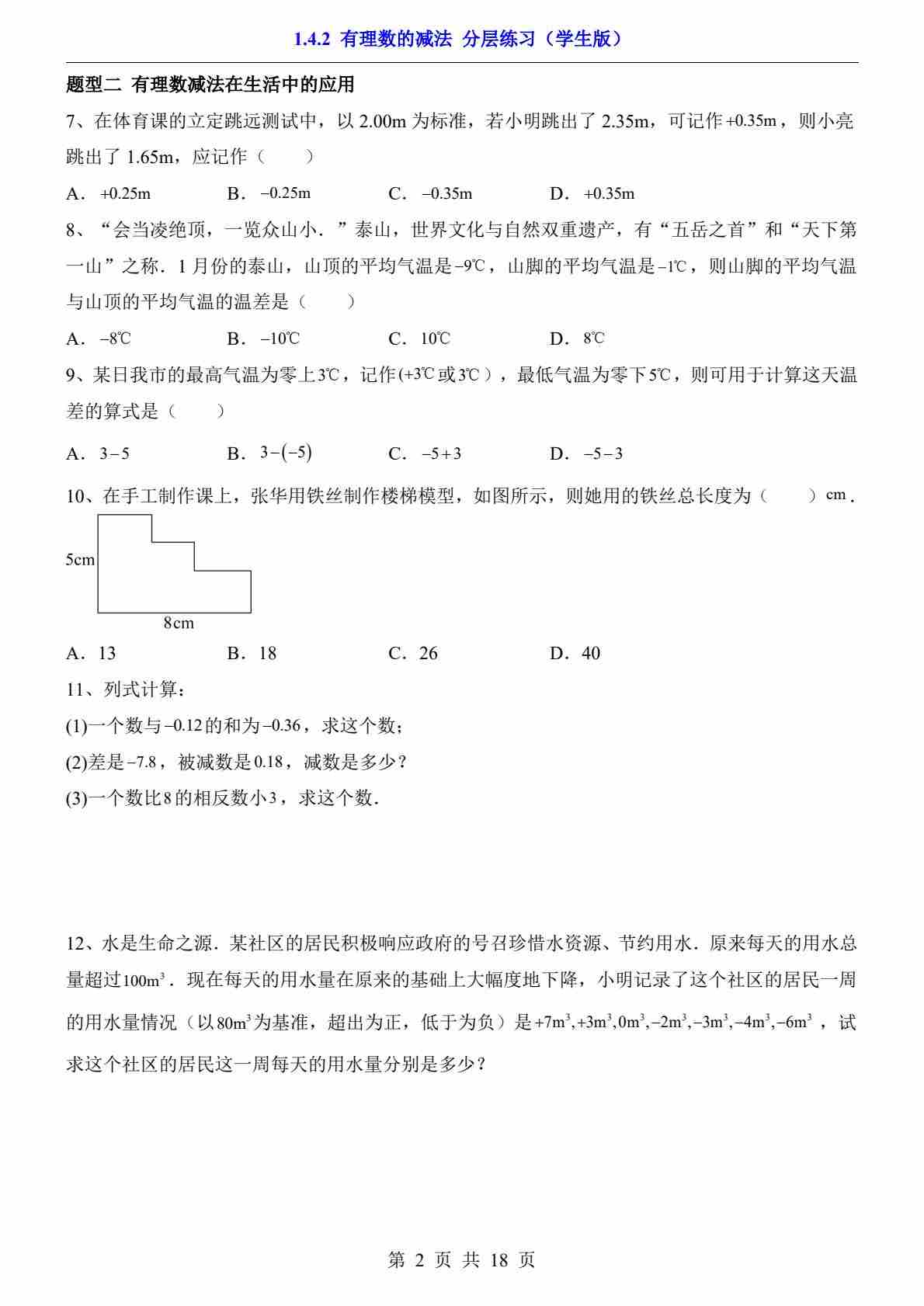 首页 > 全部 > 一课一练 > 1.4.2 有理数的减法(分层练习)