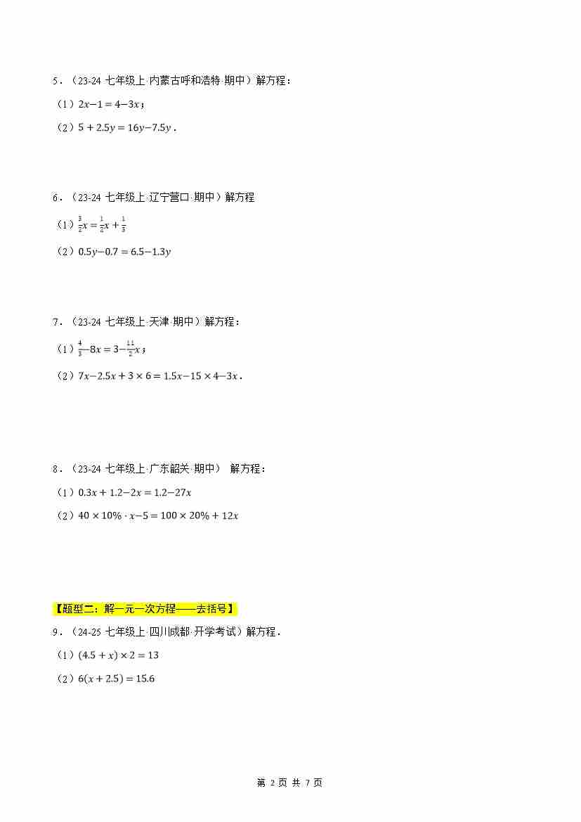首页 > 全部 > 计算题专练 > 专题11 一元一次方程的计算四大题型总结(计算题专训练)(湘教版2024)(原卷版)