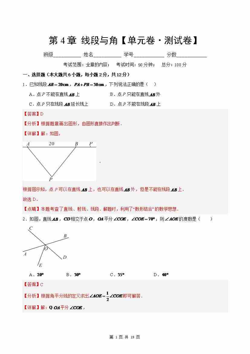 首页 > 全部 > 单元AB卷 > 【沪教】第4章:线段与角【单元卷·测试卷】(解析版)