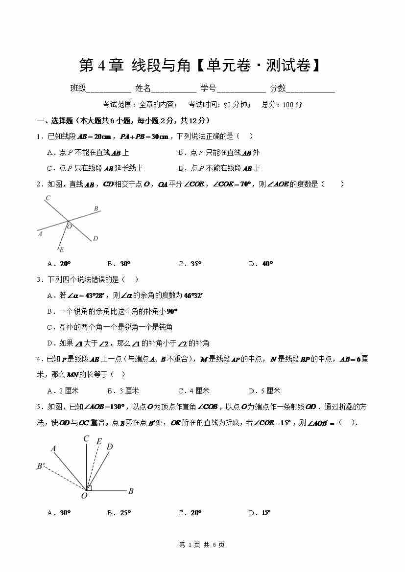 首页 > 全部 > 单元AB卷 > 【沪教】第4章:线段与角【单元卷·测试卷】(原卷版)