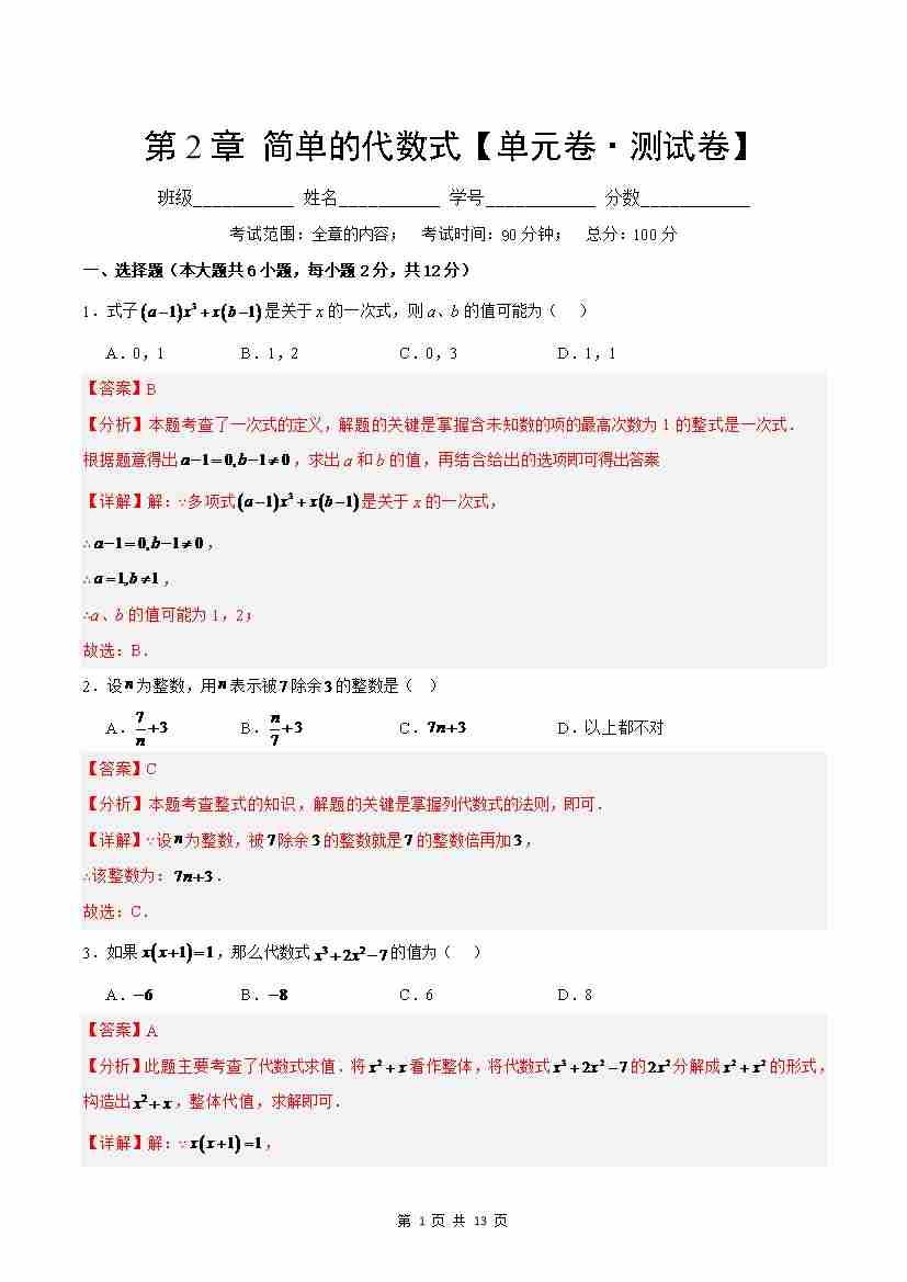 首页 > 全部 > 单元AB卷 > 【沪教】第2章:简单的代数式【单元卷·测试卷】(解析版)