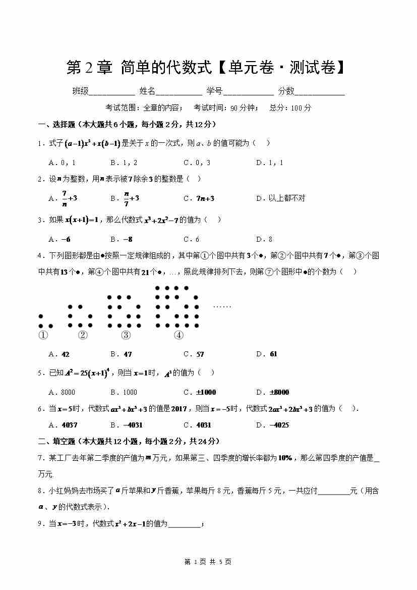 首页 > 全部 > 单元AB卷 > 【沪教】第2章:简单的代数式【单元卷·测试卷】(原卷版)