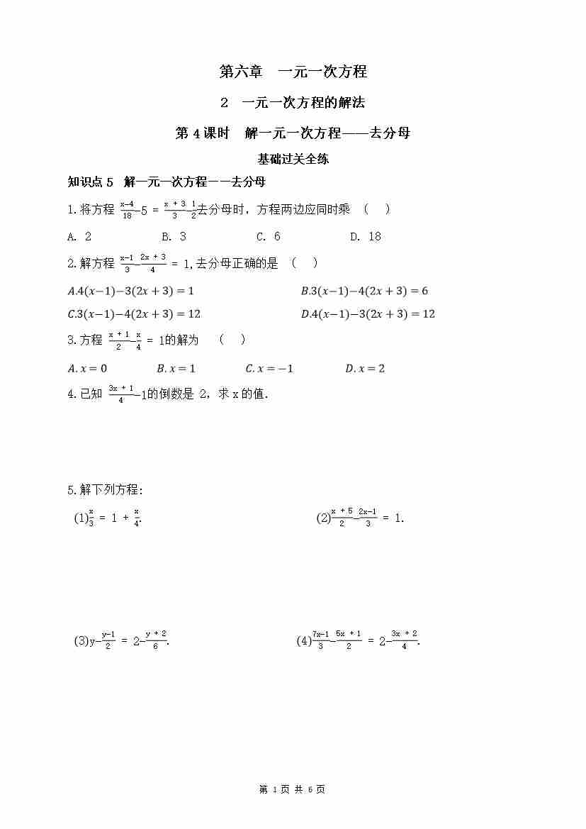 首页 > 全部 > 同步练习 > 6.2.4 解一元一次方程——去分母(含答案)