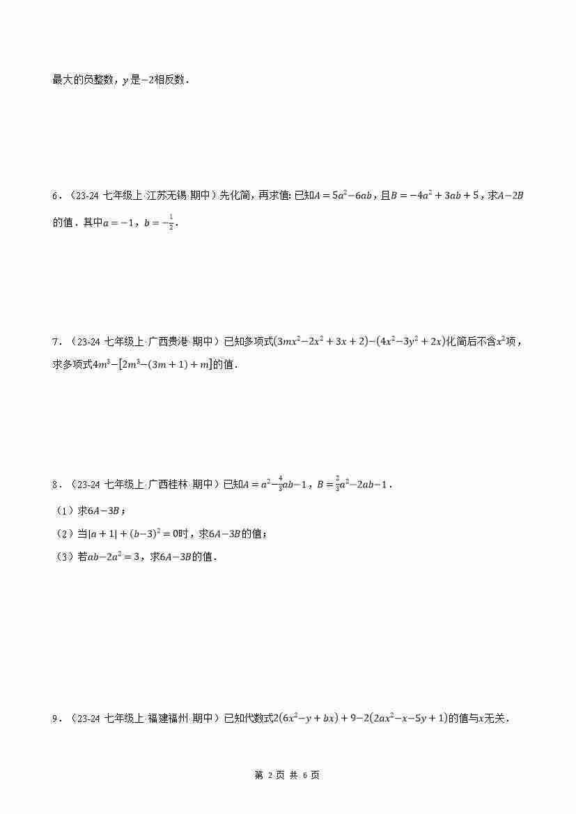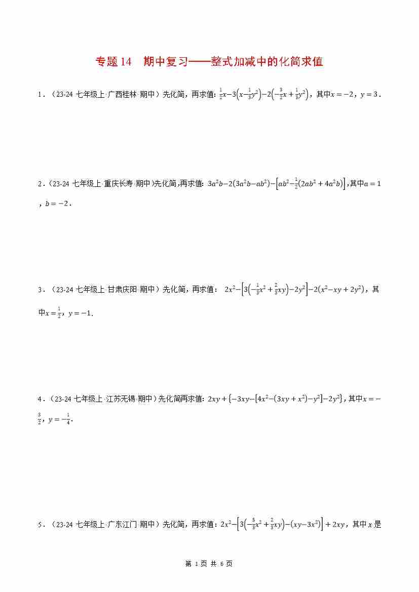 首页 > 全部 > 计算题专题 > 专题14 期中复习——整式加减中的化简求值(原卷版)