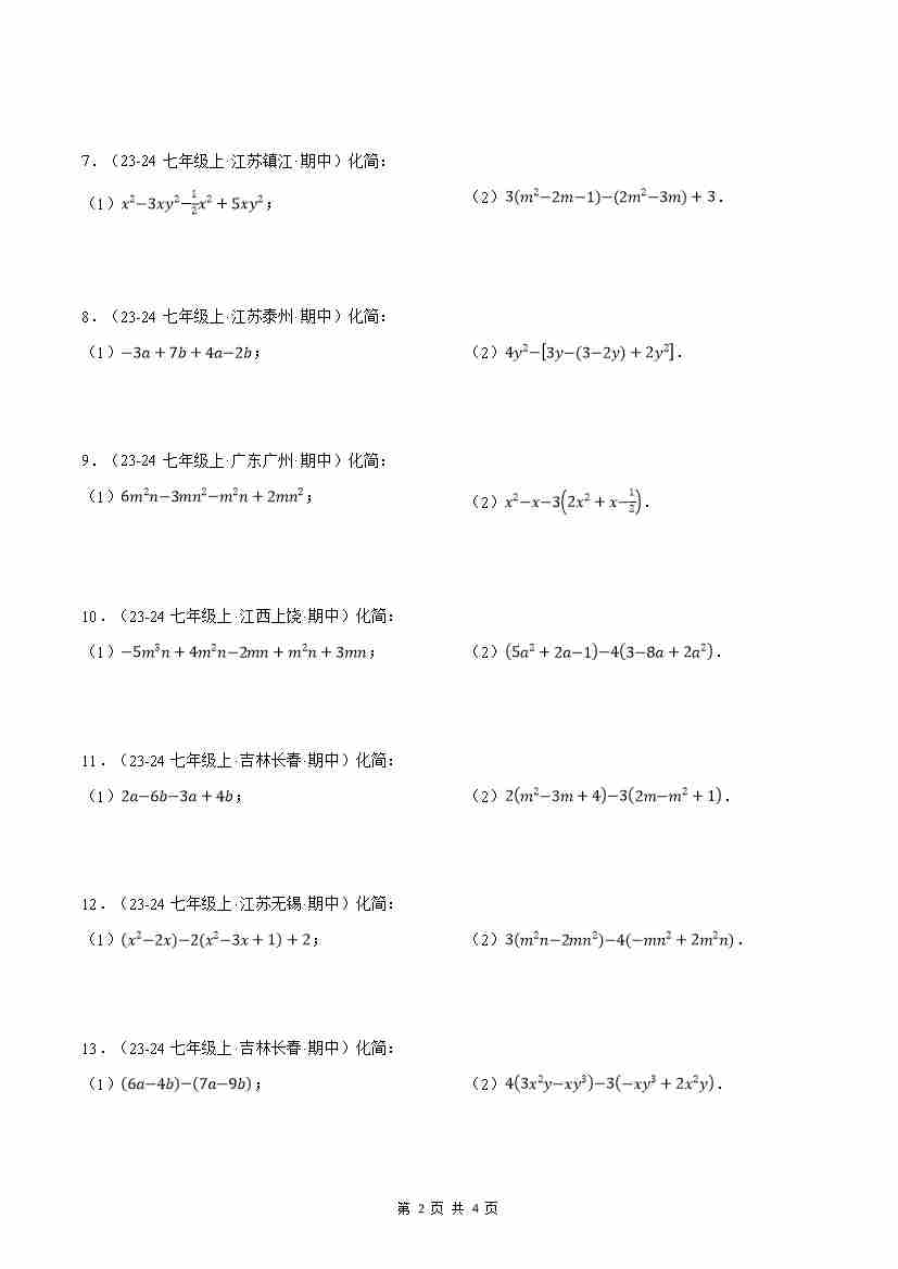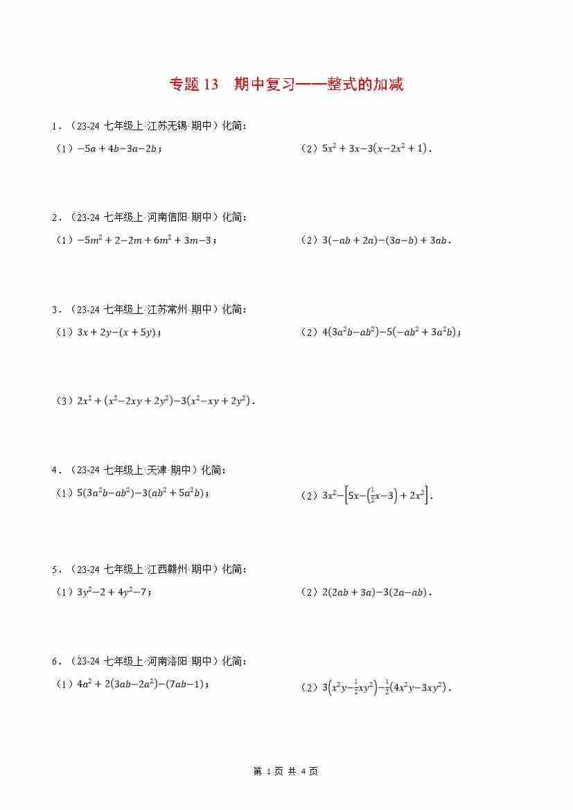 首页 > 全部 > 计算题专题 > 专题13 期中复习——整式的加减(原卷版)