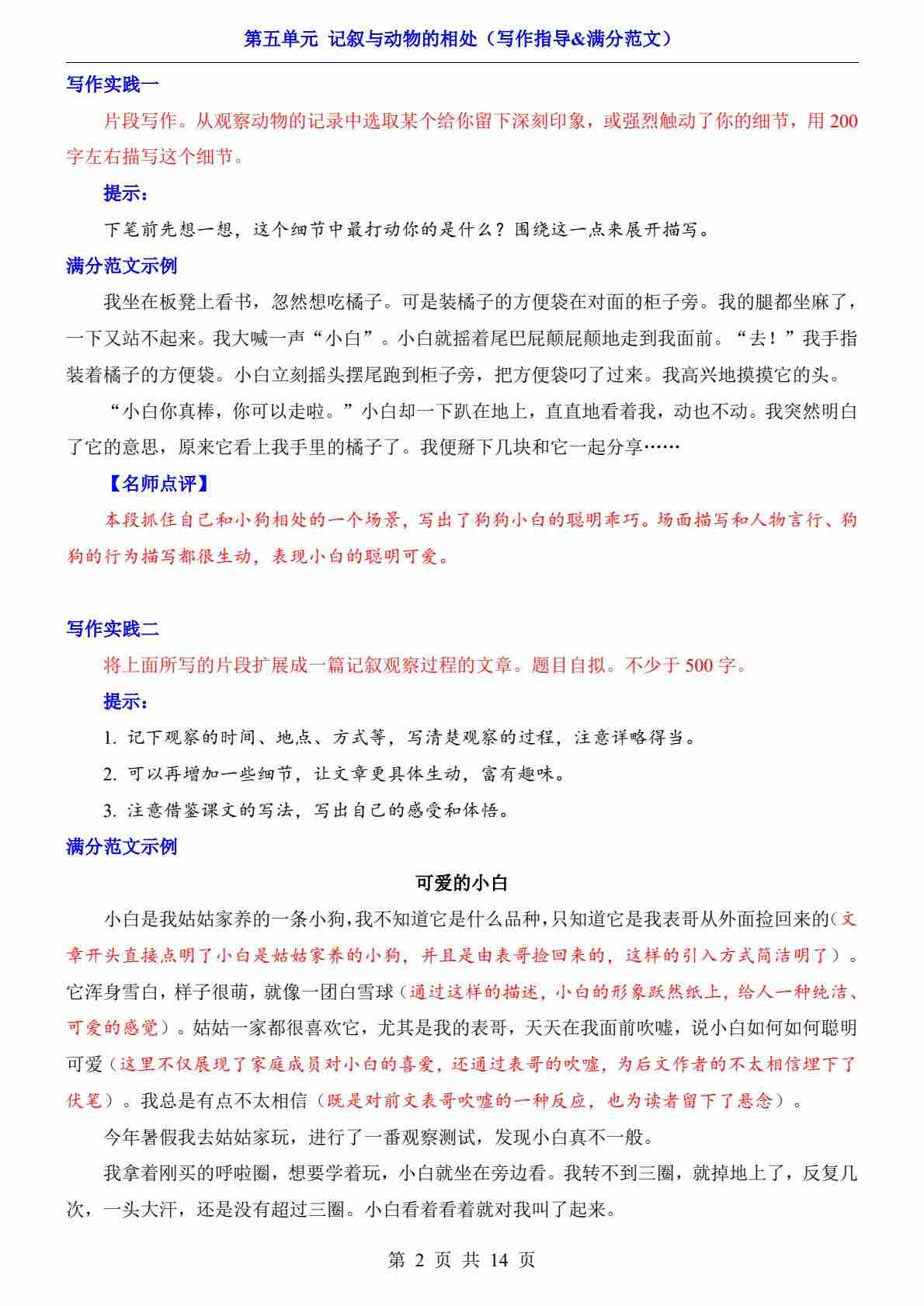 第5单元 记叙与动物的相处(写作指导&满分范文)