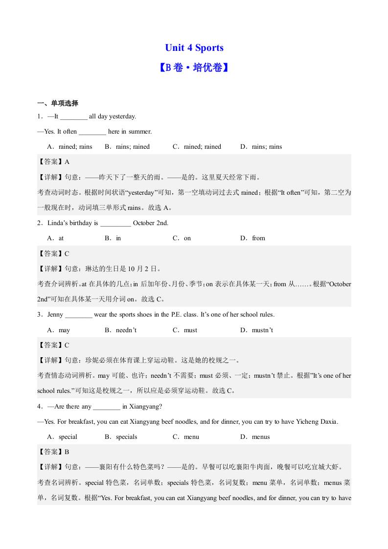 首页 > 全部 > 单元培优卷 > Unit 4 Sports(B卷·培优卷)(教师版)