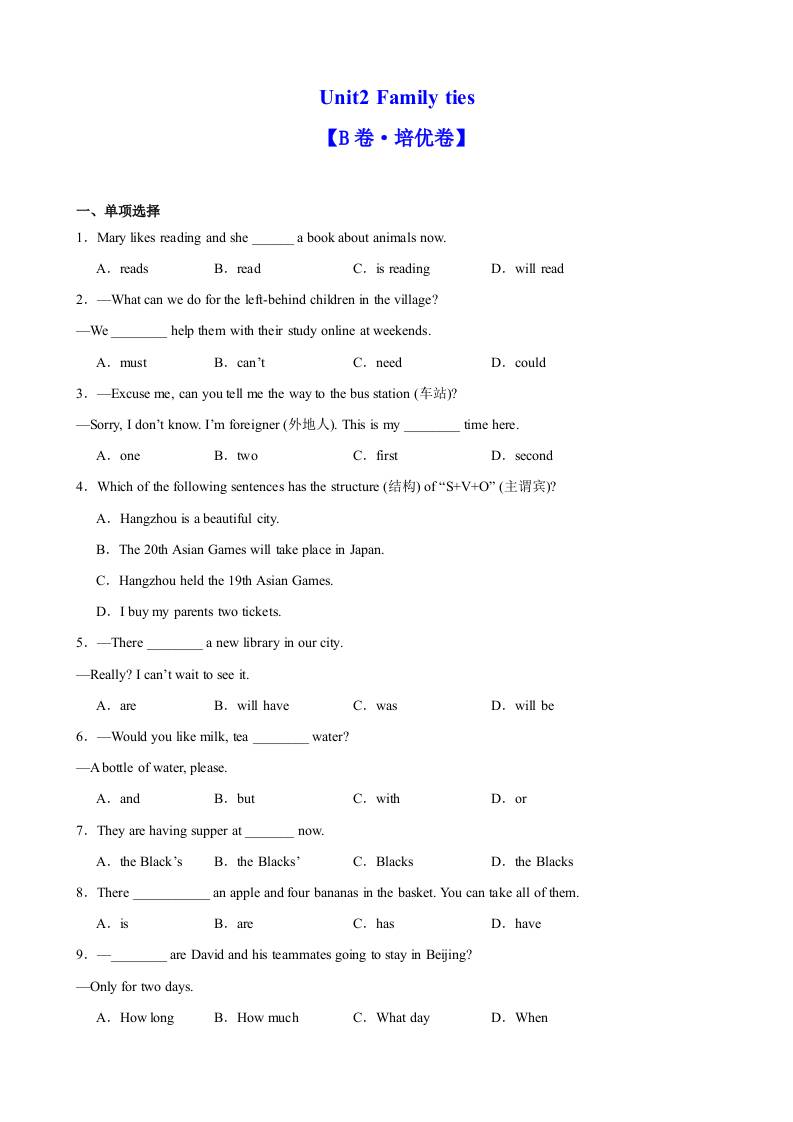 Unit 2 Family ties(B卷·培优卷)(学生版)