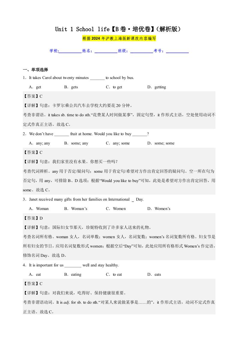 首页 > 全部 > 单元培优卷 > Unit 1 School life(B卷·培优卷)(教师版)