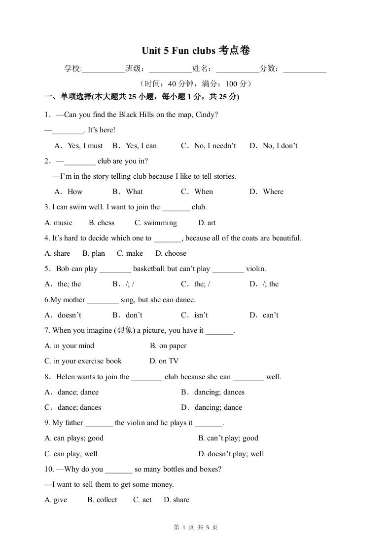 Unit 5 Fun clubs 【单元卷·考点卷】(单词短语句型语法)(原版)