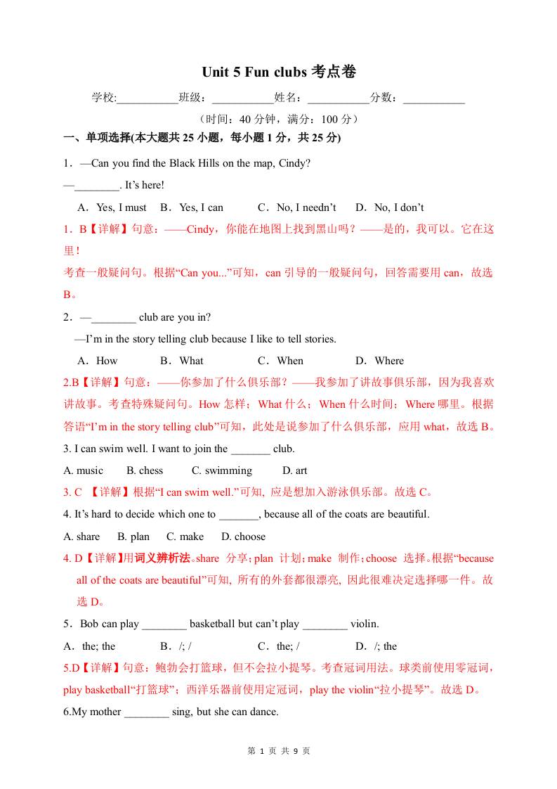 Unit 5 Fun clubs 【单元卷·考点卷】(单词短语句型语法)(解析版)