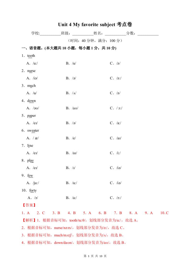 Unit 4 My favorite subject【单元卷·考点卷】(单词短语句型语法)(解析版)