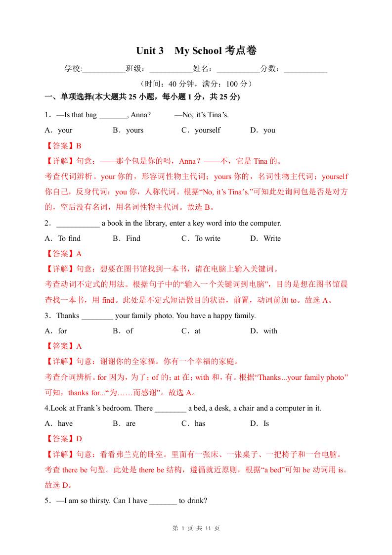 Unit 3 My school【单元卷·考点卷】(单词短语句型语法)(解析版)