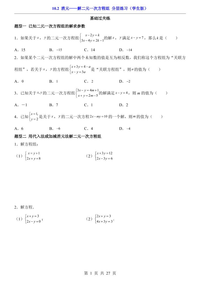 首页 > 全部 > 一课一练 > 10.2 消元——解二元一次方程组(分层练习)