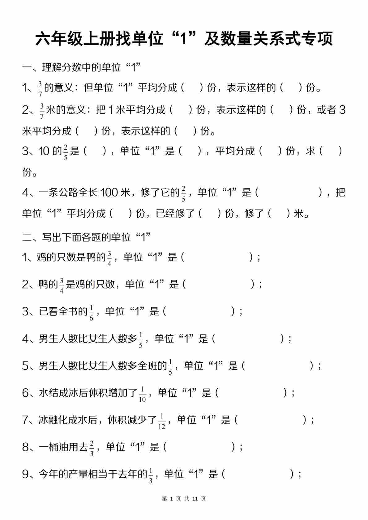 首页 > 全部 > 专项练习 > 六(上)数学人教版找单位“1”及数量关系式专项