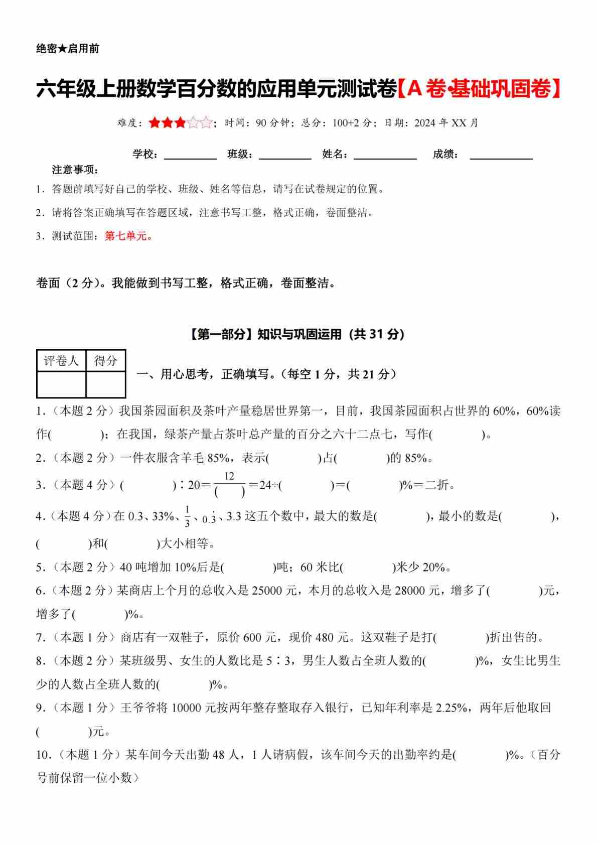 六(上)数学人教版【百分数的应用单元测试卷(A卷·基础巩固卷)】