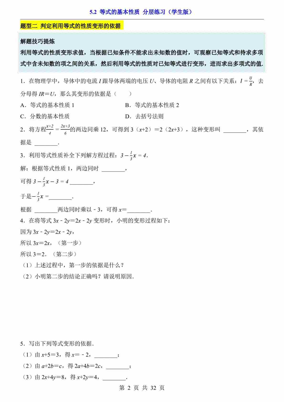 5.2 等式的基本性质(分层练习)