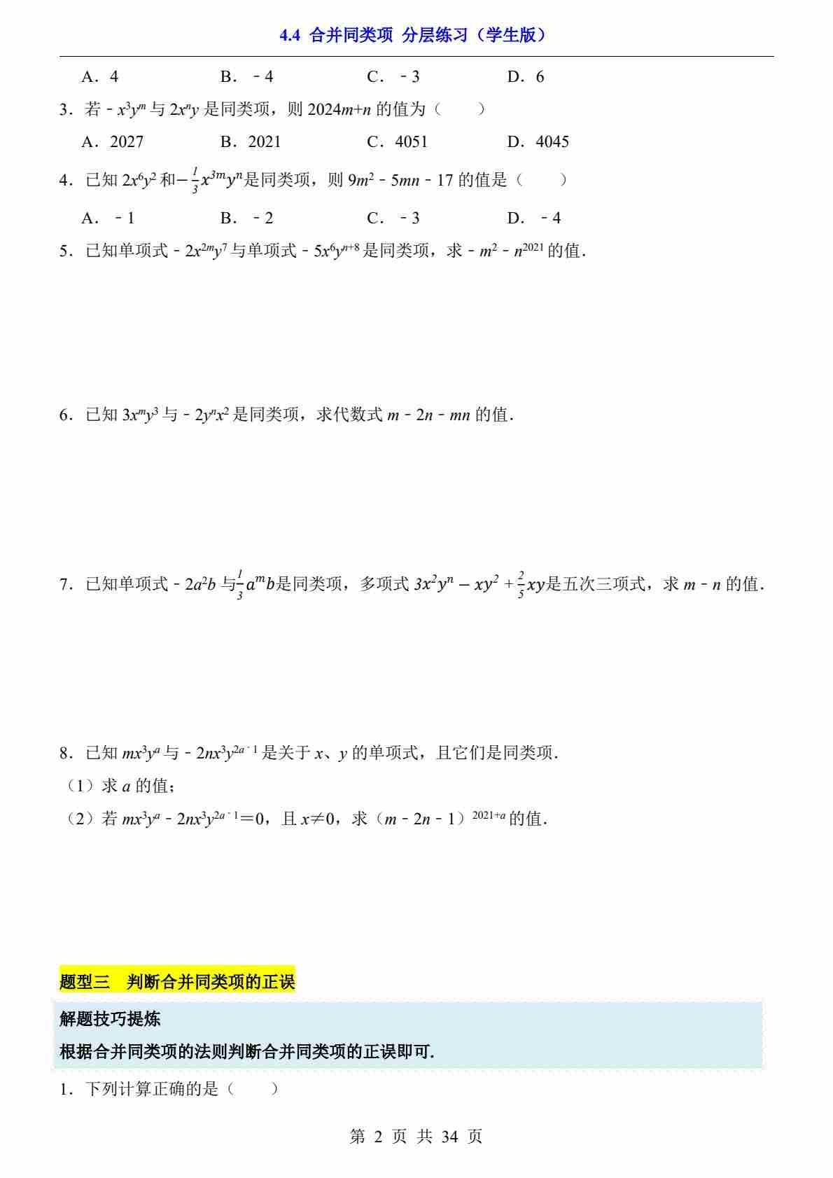 首页 > 全部 > 一课一练 > 4.4 合并同类项(分层练习)