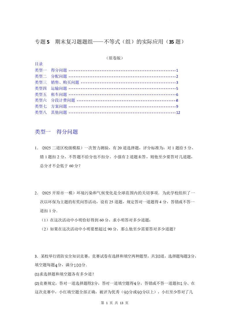 专题5 期末复习题题组——不等式(组)的实际应用(35题)2025年人教版7年级下册数学(高效学习) 专题5 期末复习题题组——不等式(组)的实际应用(35题)(原卷版)