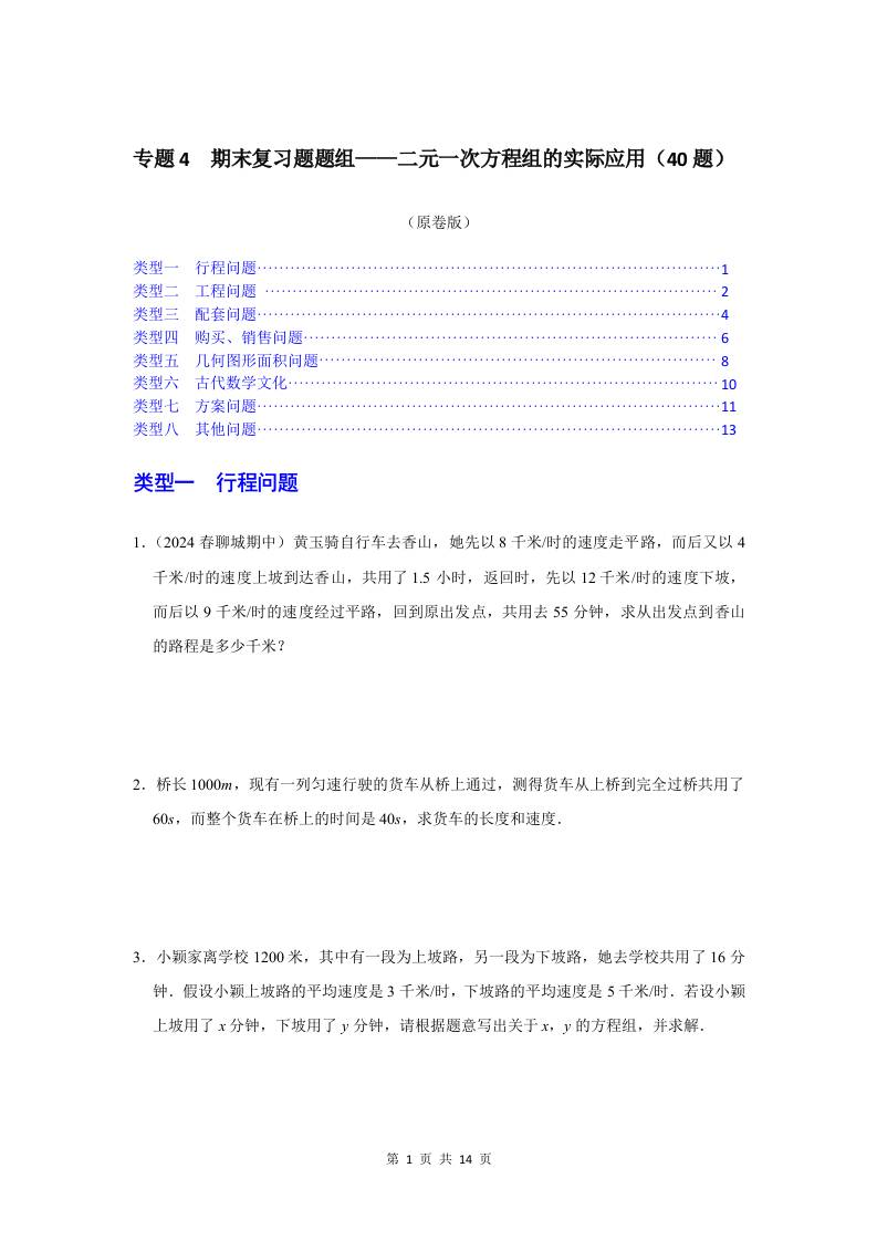首页 > 全部 > 期末专项2 > 专题4 期末复习题题组——二元一次方程组的实际应用(40题)(原卷版)
