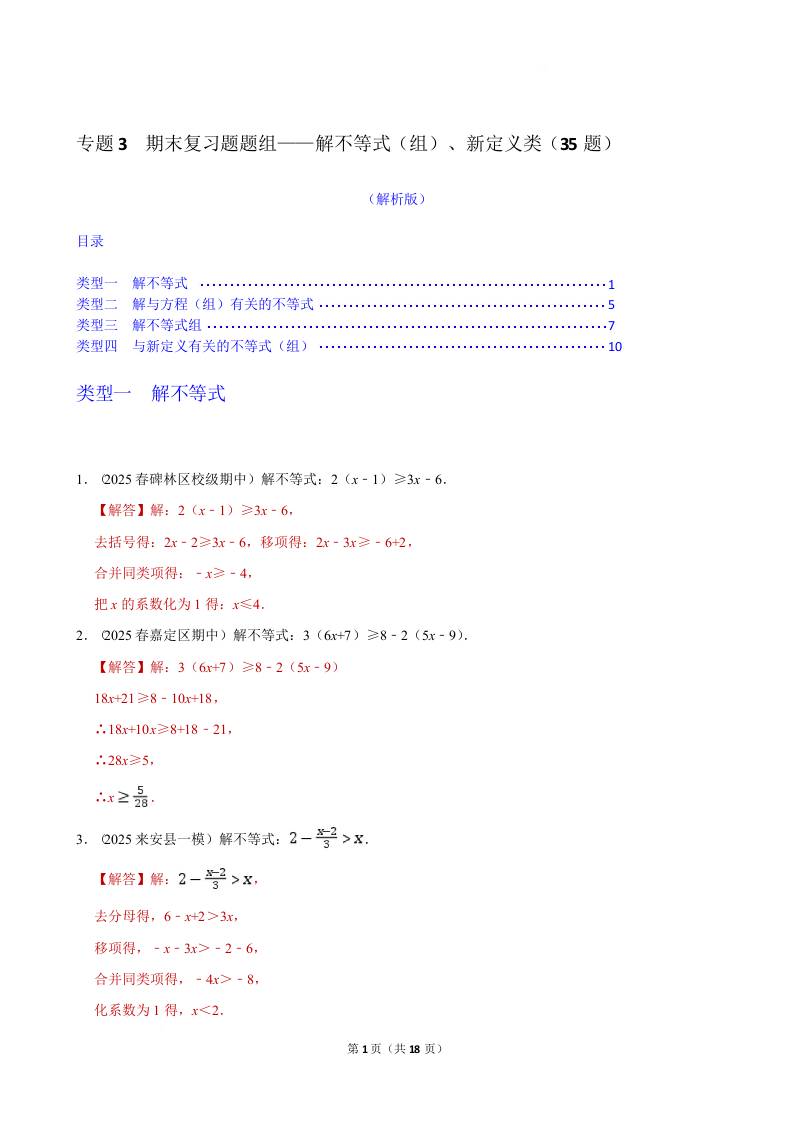 首页 > 全部 > 期末专项2 > 专题3 期末复习题——解不等式(组)、新定义类(35道)2024-2025学年人教版数学七年级下册(答案版)