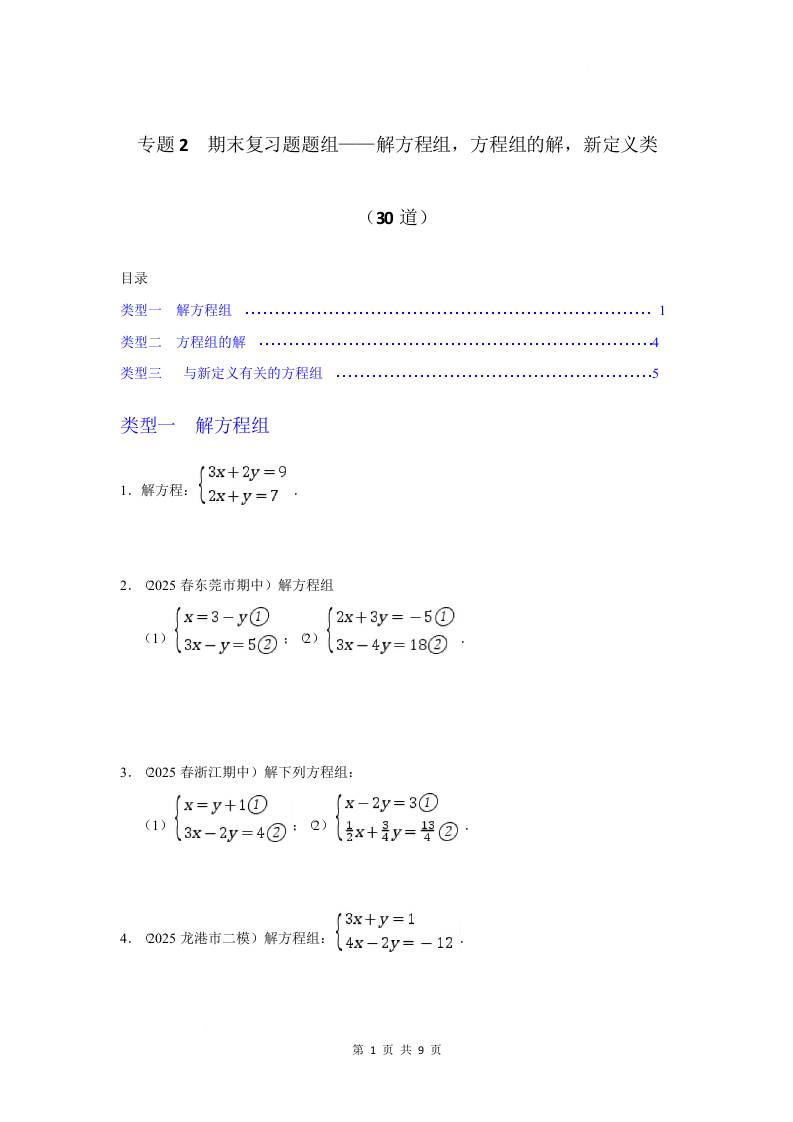 专题2 期末复习题题组——解方程组、方程组的解、新定义类(30道)2025年人教版7年级下册数学(高效学习) 专题2 期末复习题题组——解方程组、方程组的解、新定义类(原卷版)
