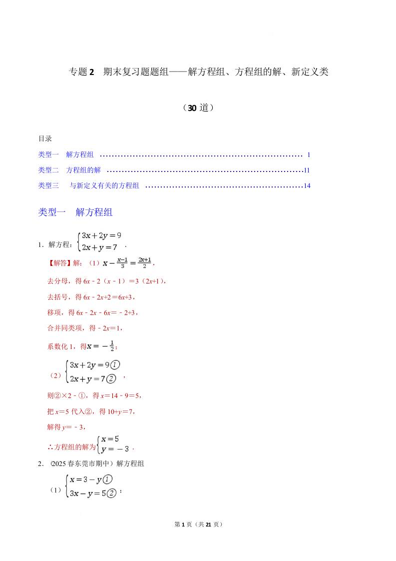 首页 > 全部 > 期末专项2 > 专题2 期末复习题题组——解方程组、方程组的解、新定义类(30道)2025年人教版7年级下册数学(高效学习) 专题2 期末复习题题组——解方程组、方程组的解、新定义类(解析版)