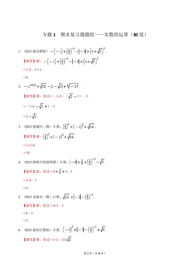 首页 > 全部 > 期末专项2 > 专题1 期末复习题题组——实数的运算(30道)2025年人教版7年级下册数学(高效学习) 专题1 期末复习题题组——实数的运算(30道)(解析版)