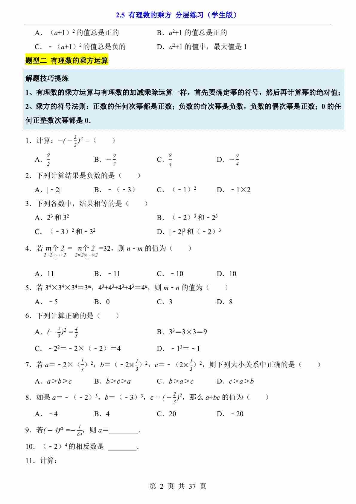 2.5 有理数的乘方(分层练习)