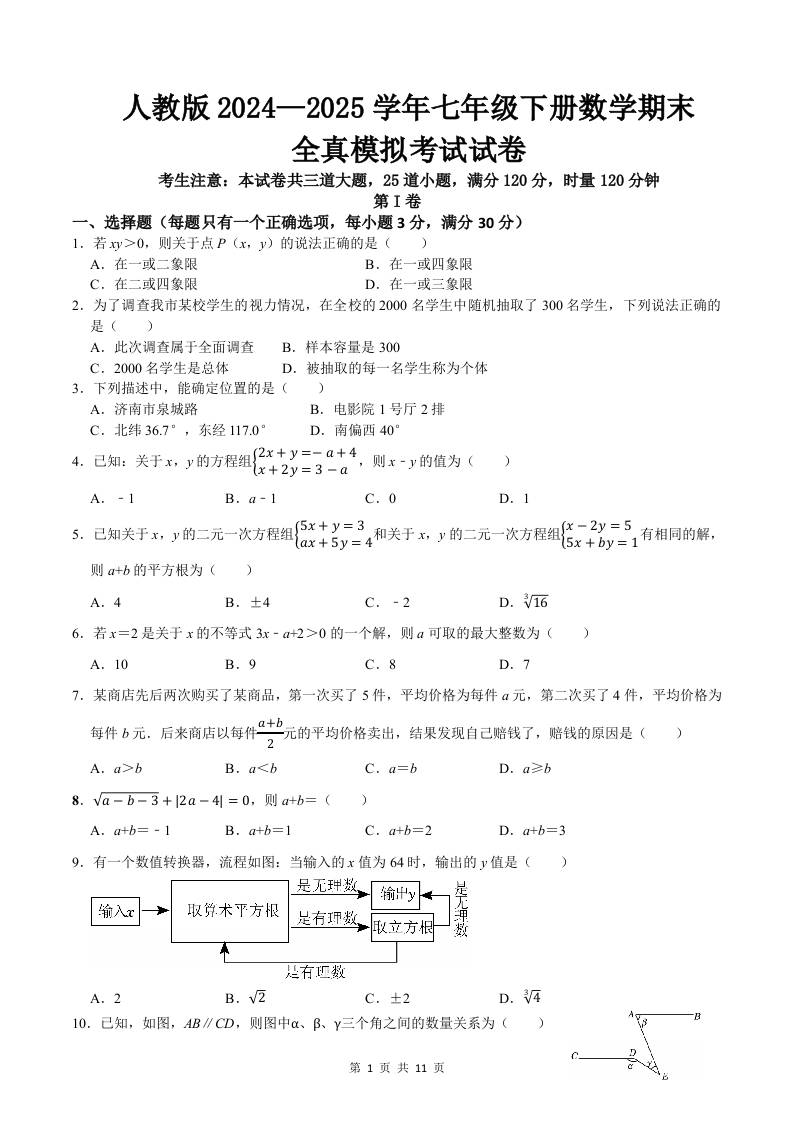 人教版2024—2025学年七年级下册数学期末全真模拟考试试卷(含答案)