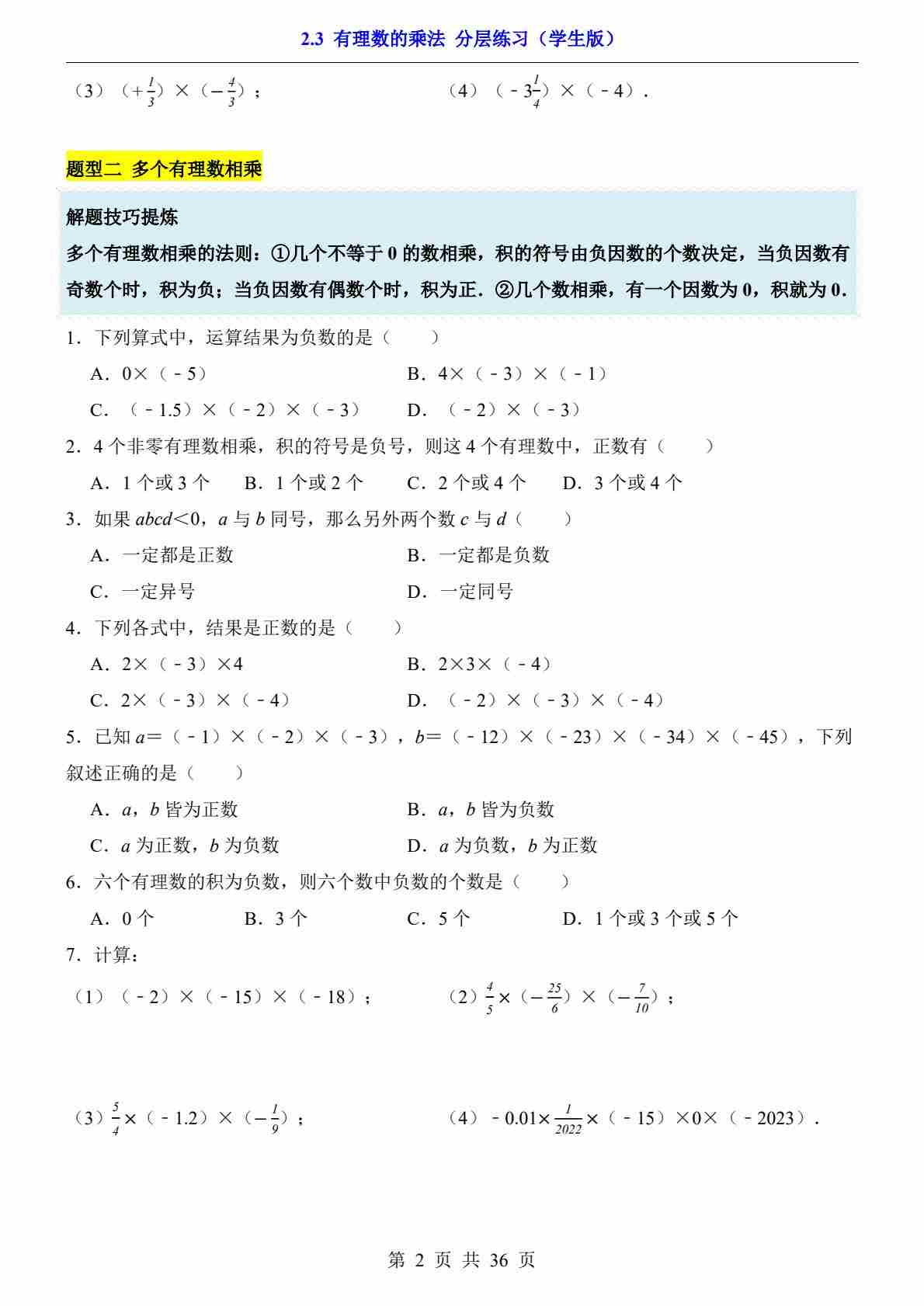2.3 有理数的乘法(分层练习)