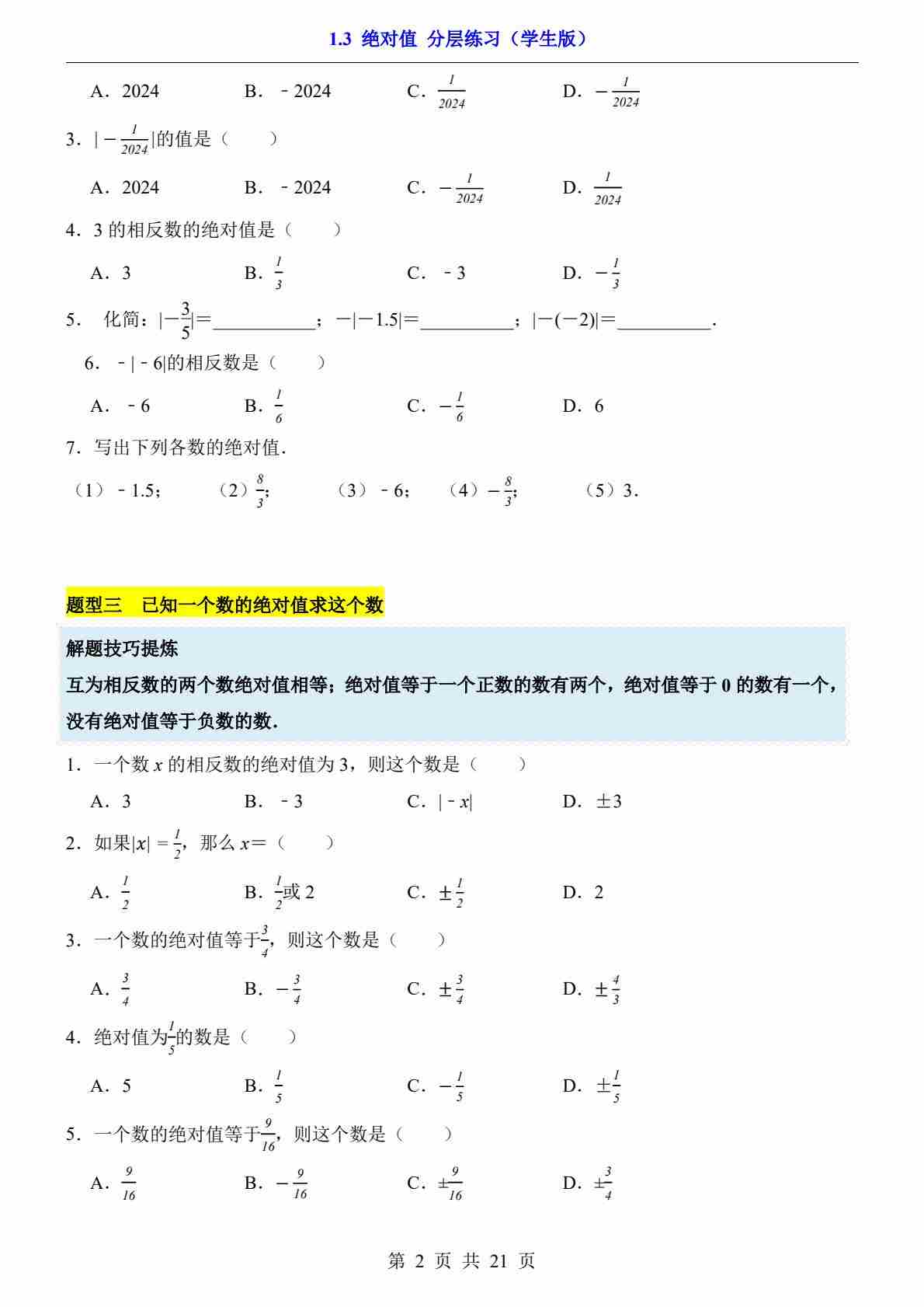 1.3 绝对值(分层练习)