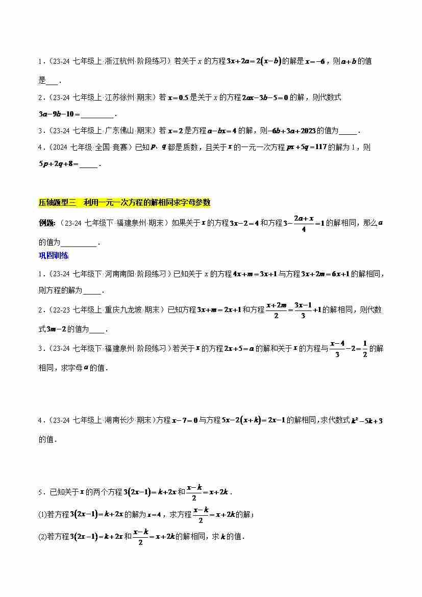 第五章 一元一次方程压轴训练(单元复习 含参数问题、换元法、新定义型)(原卷版)