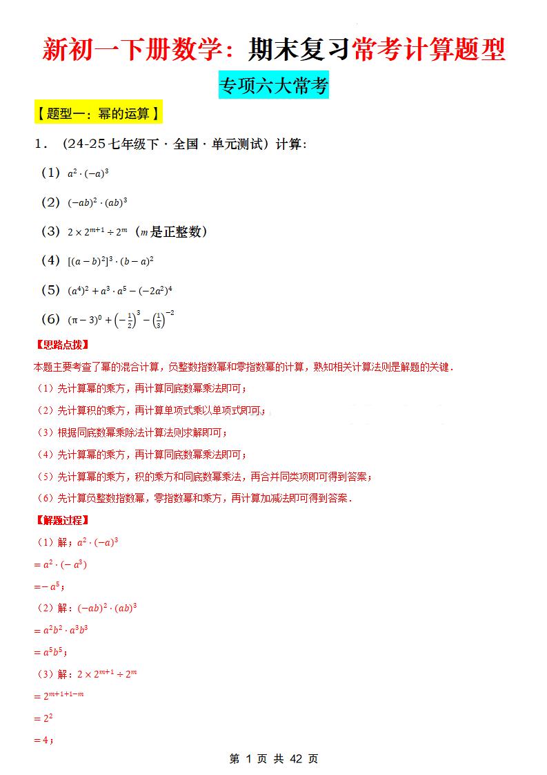 首页 > 全部 > 期末专项 > 期末复习——六大常考计算题题型总结(计算题专项训练)(湘教版2024)(解析版)