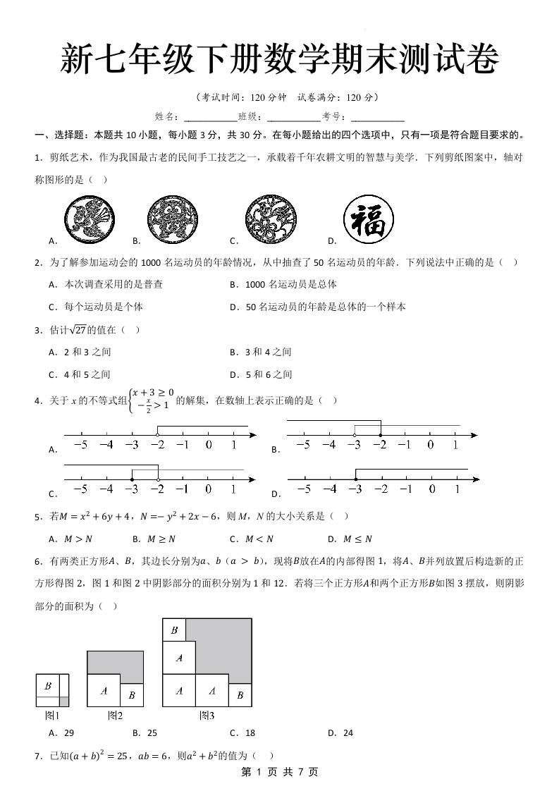 2024-2025学年七年级期末测试卷(原卷版)——湘教版