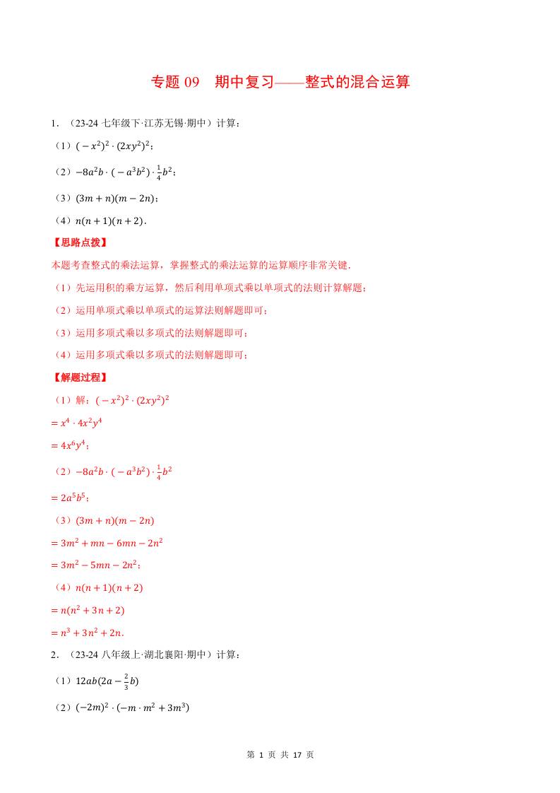 首页 > 全部 > 计算专项 > 专题09 期中复习——整式的混合运算(计算题专项训练)(湘教版2024)(解析版)